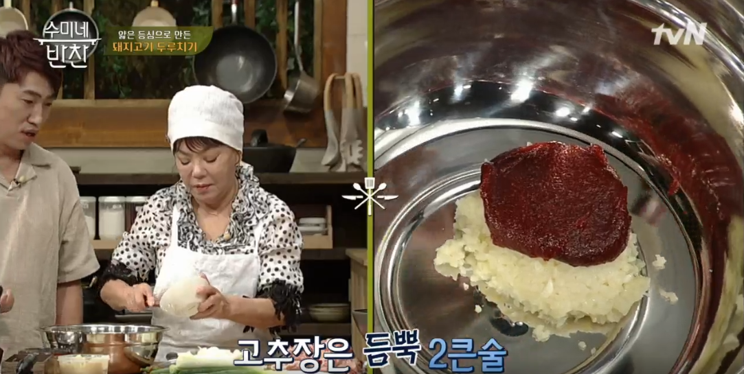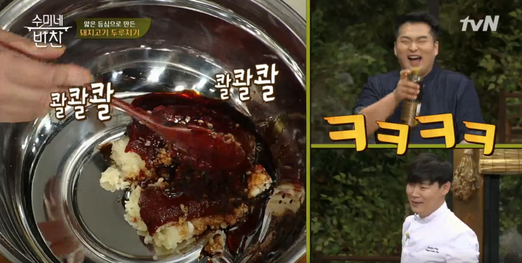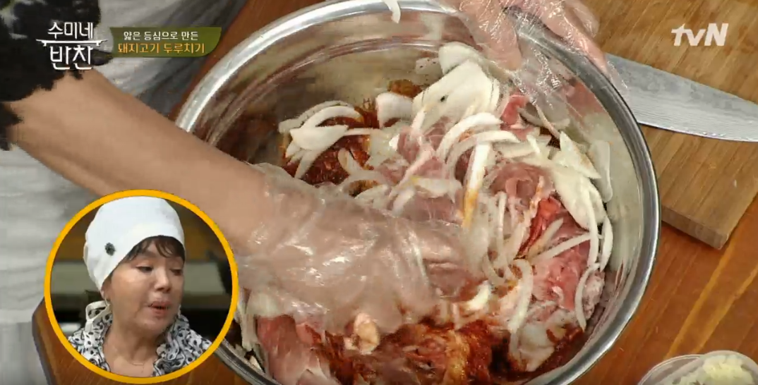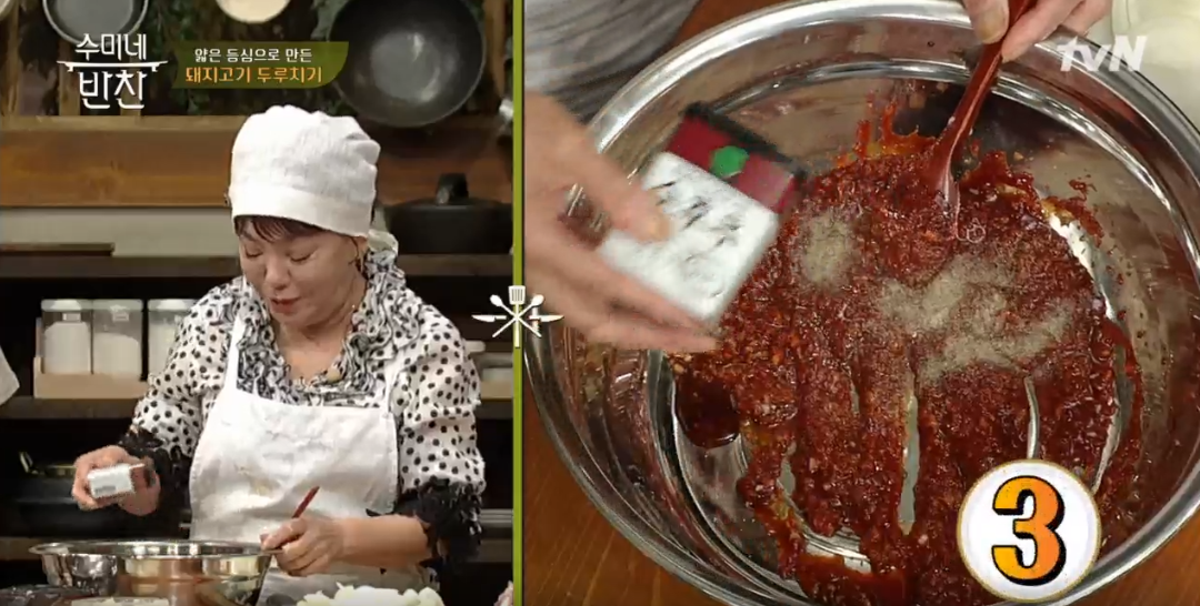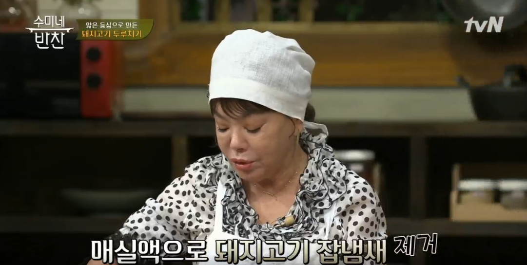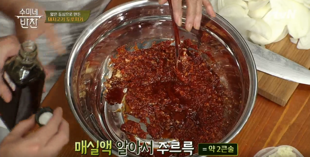 9. 돼지고기 잡냄새를 잡기 위해 매실액을 넣어주는데요. 넣는 양은 알아서 주르륵! 시청자를 위해 친절히 약2큰술이라고 자막을 달아주었네요.