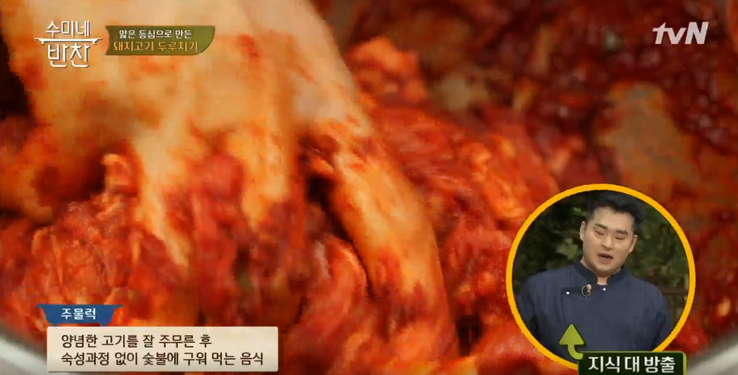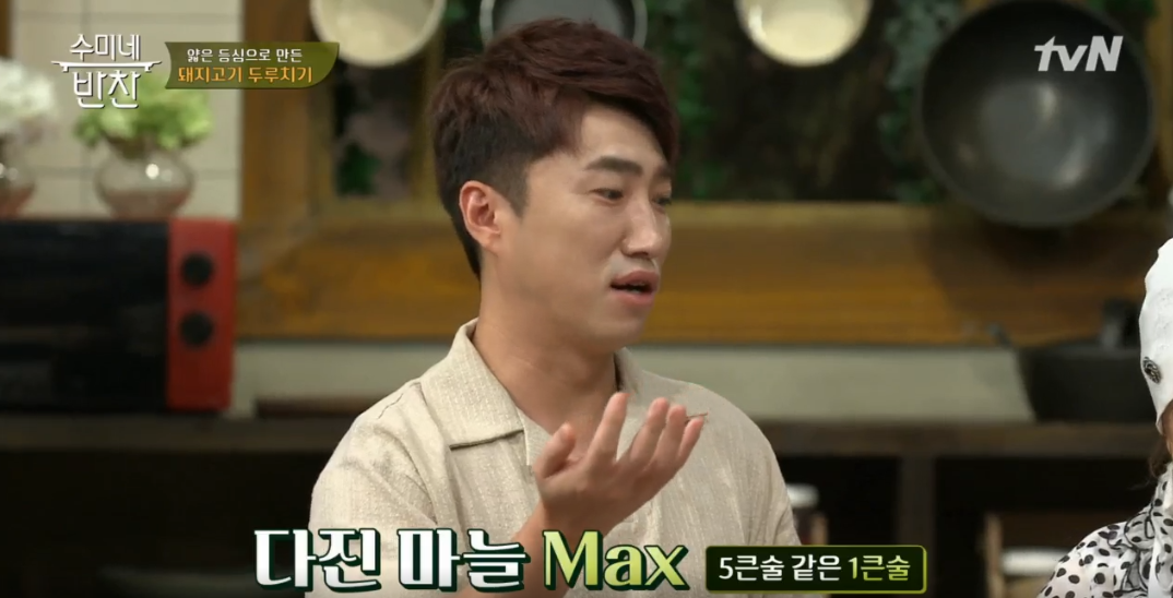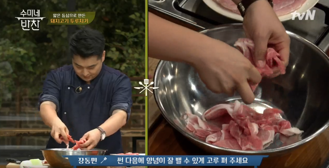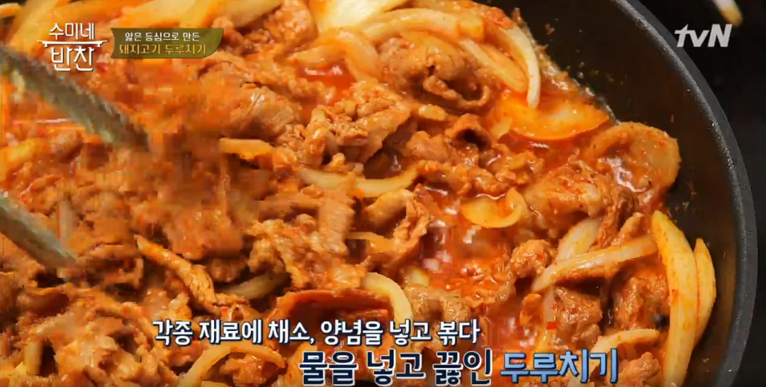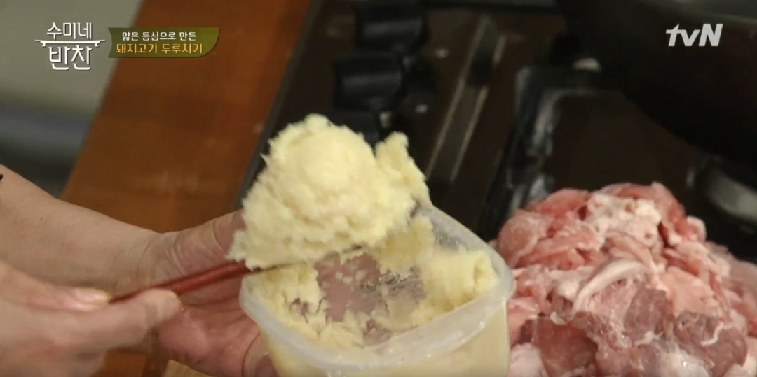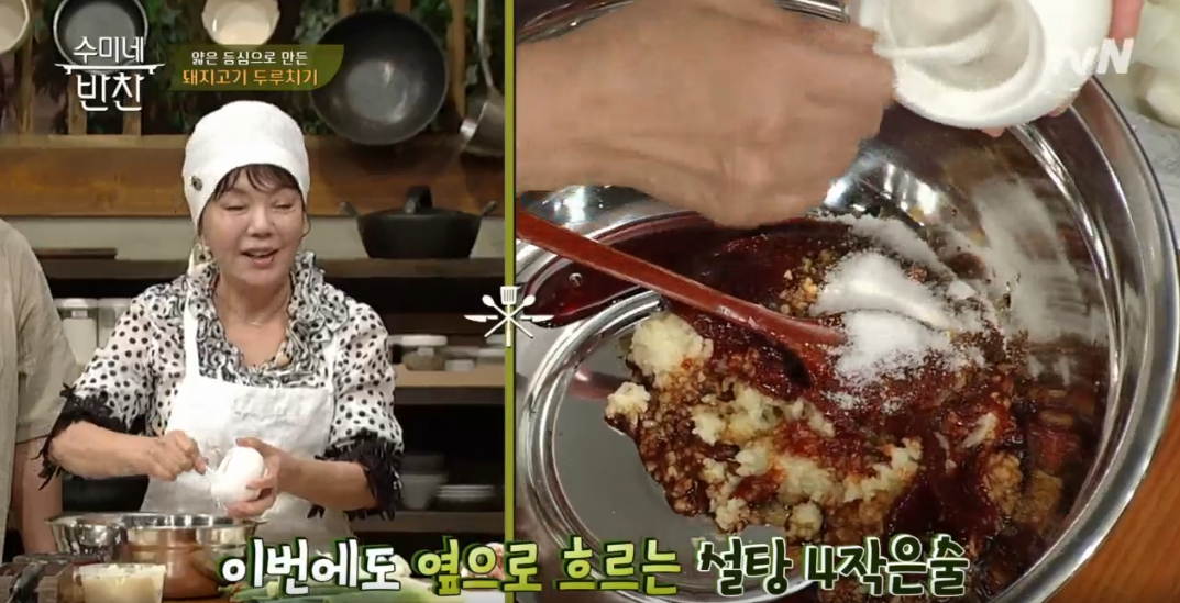9. 돼지고기 잡냄새를 잡기 위해 매실액을 넣어주는데요. 넣는 양은 알아서 주르륵! 시청자를 위해 친절히 약2큰술이라고 자막을 달아주었네요.