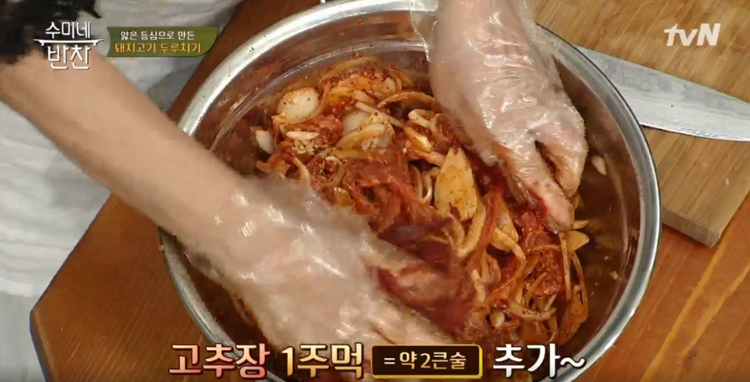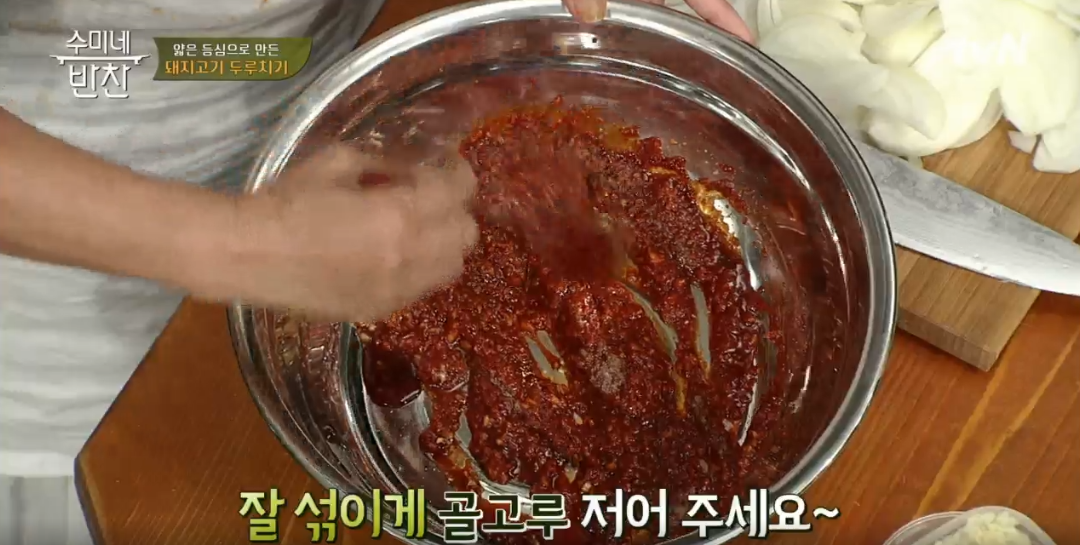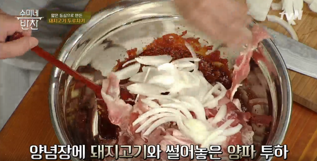 14. 양념장에 돼지고기와 썰어놓은 양파를 넣고 버무려줍니다. 고추장이 모자란지 고추장 1큰술을 추가했어요. 수미샘 레시피는 이래서 재밌는것 같아요. 총 고추장 양은 4큰술입니다.