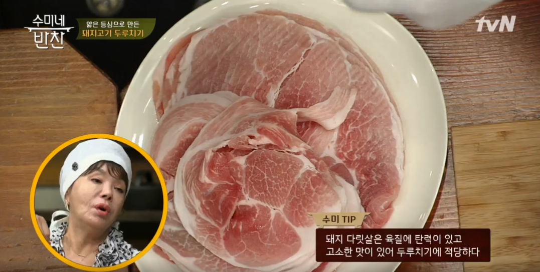뒷다리살은 비교적 선호하지않는 부위이지만, 육질에 탄력이 있고 고소한 맛이 있어서 두루치기에 적당하대요. 가격도 싸니까 많이 먹어줘야죠. 얇게 썰은 것을 준비하는 것이 포인트!