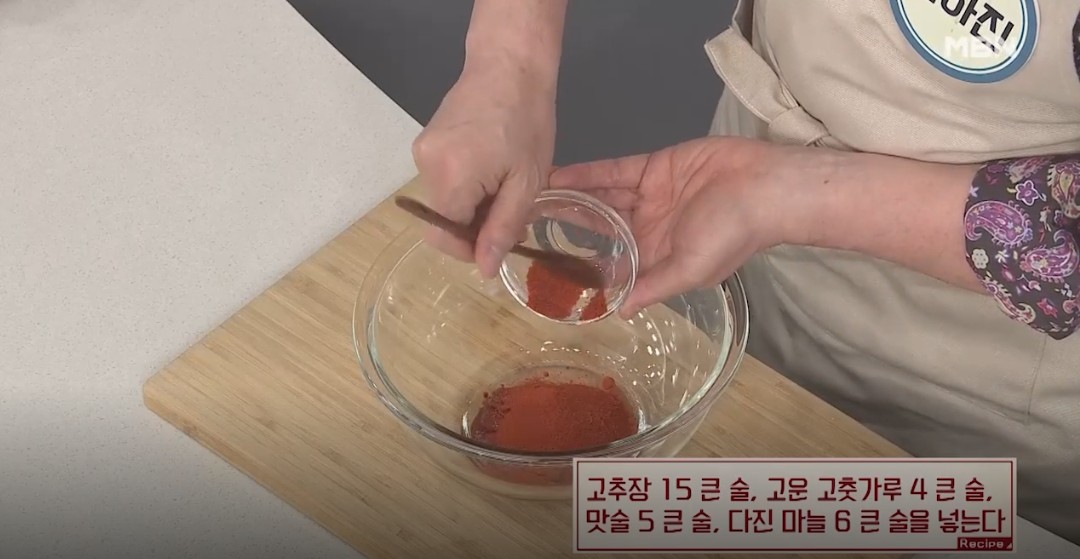 6. 고추장, 고운 고춧가루, 맛술, 다진마늘을 넣어서 양념장을 만듭니다.