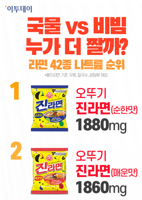 라면 몸에 나쁜 가장 첫번째 이유는 고함량의 나트륨 때문인데요. 그렇다면 시중에 판매되는 라면 중 어떤 것이 가장 나트륨 함량이 높을까요? 이투데이에서 국물라면과 비빔라면까지 총 42종을 비교하여 순위를 메겨보았습니다.