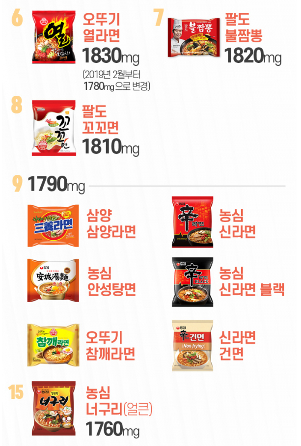 6위는 오뚜기 열라면, 7위 팔도 불짬뽕, 8위 팔도 꼬꼬면, 9위 삼양 삼양라면, 농심 신라면, 농심 안성탕면, 농심 신라면 블랙, 오뚜기 참깨라면, 신라면 건면이 차지했고, 9위는 농심 너구리네요.