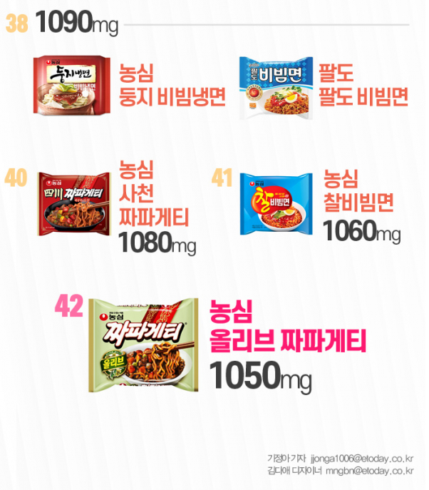 시중에 워낙 많은 라면이 있기 때문에 42종안에 모두 포함되지는 않았지만, 생각과는 달리 의외의 제품들의 나트륨함량이 높아서 깜놀했네요. 그리고 짜파게티는 높을 줄 알았는데 그리 높지않았구요.