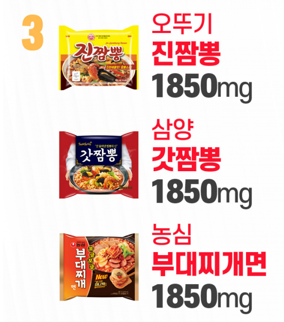 나란히 3위를 차지한 3개의 라면은 오뚜기 진짬뽕, 삼양 갓짬뽕, 농심 부대찌개면입니다. 짬뽕과 부대찌개 맛이기 때문에 나트륨이 높을것이라 예상되긴 했었는데요. 진라면보다 낮은 나트륨이지만 1850mg으로 꽤 높습니다.