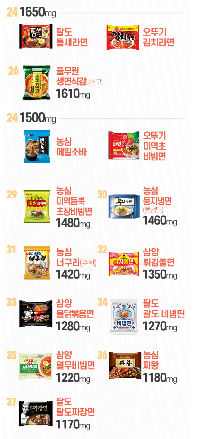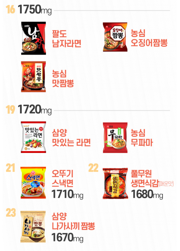 국물라면과 비빔라면 중 비빔라면 쪽이 나트륨이 적다는 말은 들었지만, 이렇게 순위를 확인해보니 그 말이 사실이네요. 그렇지만 비빔라면은 소스까지 모두 먹는다는게 함정이죠.