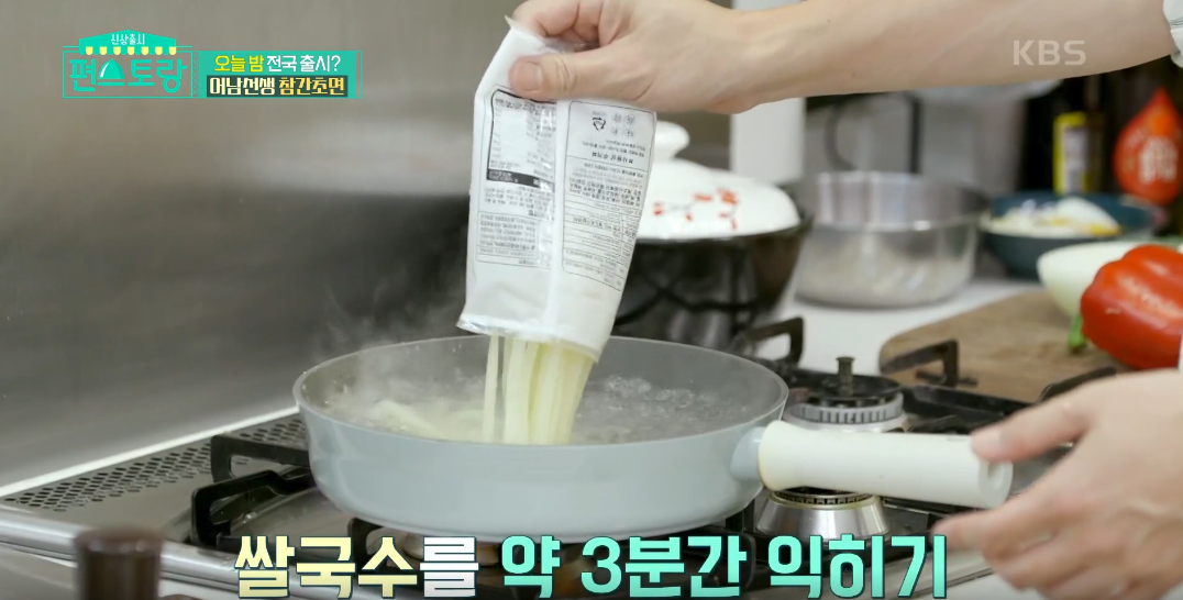 1. 쌀국수면을 끓는 물에 약 1분간 익혀줍니다. 일반 국수대신 쌀국수면을 사용했네요. 납작한 칼국수면같은 모양의 국내산 쌀국수면을 사용해서 더 좋아요.