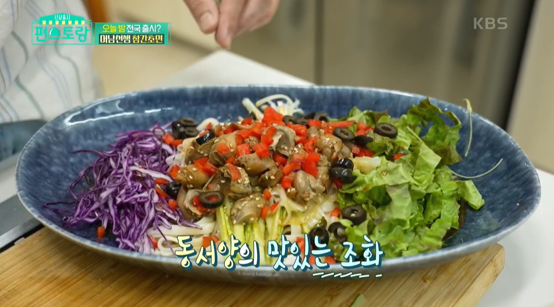 참간초 소스를 활용해서 다양한 요리들을 뚝딱 만들어낼 수 있는데요. 그중 참간초면 레시피를 가져와봤어요. 골뱅이와 올리브가 들어가 색다른 맛의 비빔국수예요.