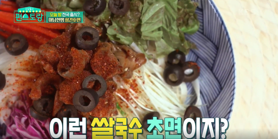 참간초 소스를 활용해서 다양한 요리들을 뚝딱 만들어낼 수 있는데요. 그중 참간초면 레시피를 가져와봤어요. 골뱅이와 올리브가 들어가 색다른 맛의 비빔국수예요.