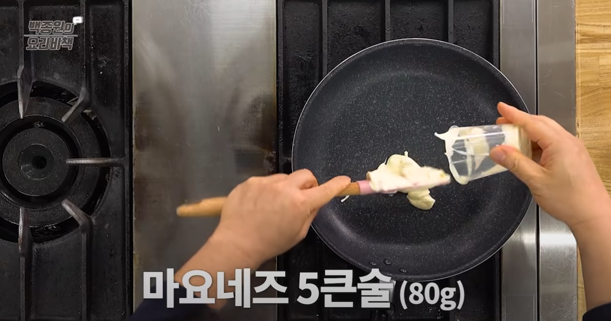 2. 팬에 마요네즈 5큰술, 황설탕 2큰술을 넣고 약한 불에서 섞어줍니다.