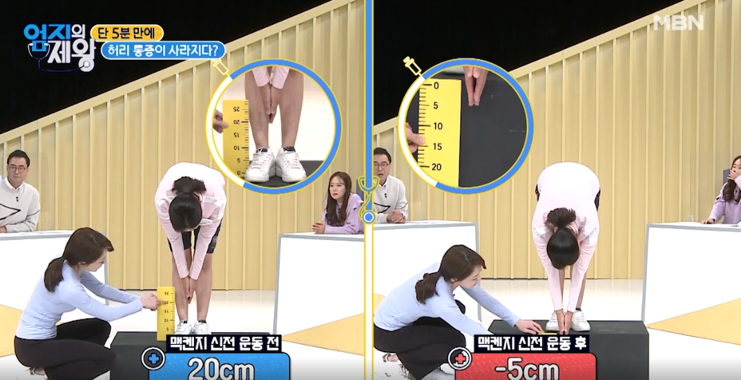 방송중에 맥켄지 운동을 따라한 주부의 운동전후 기록인데요. 신기하게도 빠른 시간안에 통증이 사라지고 허리의 근력과 유연성을 키운 맥켄지 신전운동은 바른 자세와 운동법이 핵심입니다.