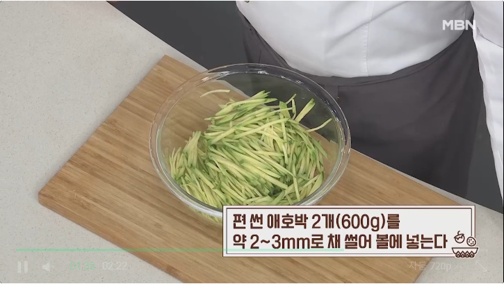 애호박 2개를 약 2~3mm 너비로 얇게 채썰어줍니다.