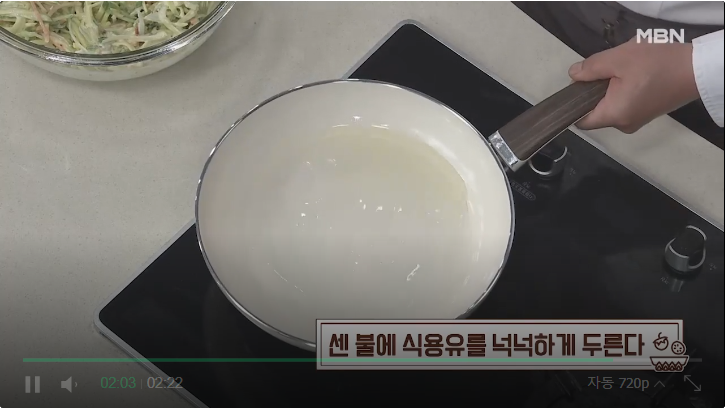 센불에 후라이팬을 달구고 식용유를 넉넉하게 둘러주세요. 식용유를 넉넉하게 둘러주어야 겉이 바삭한 애호박전을 만들수 있다고 해요.