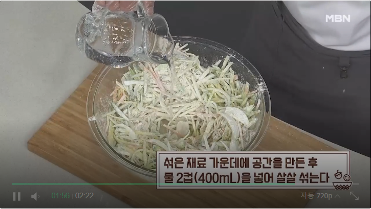 섞은 재료가운데에 공간을 만든후, 물 2컵을 넣고 살살 섞어줍니다.