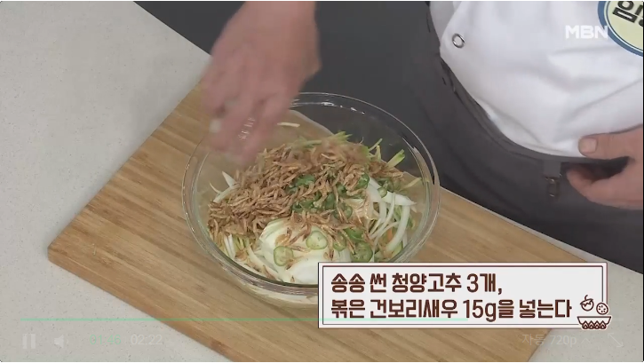 청양고추 3개를 송송 썰어주고, 볶은 건보리새우도 반컵정도 넣어줍니다. (건새우를 넣어주면 감칠맛 폭발!)