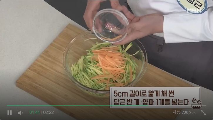 애호박 2개를 약 2~3mm 너비로 얇게 채썰어줍니다.