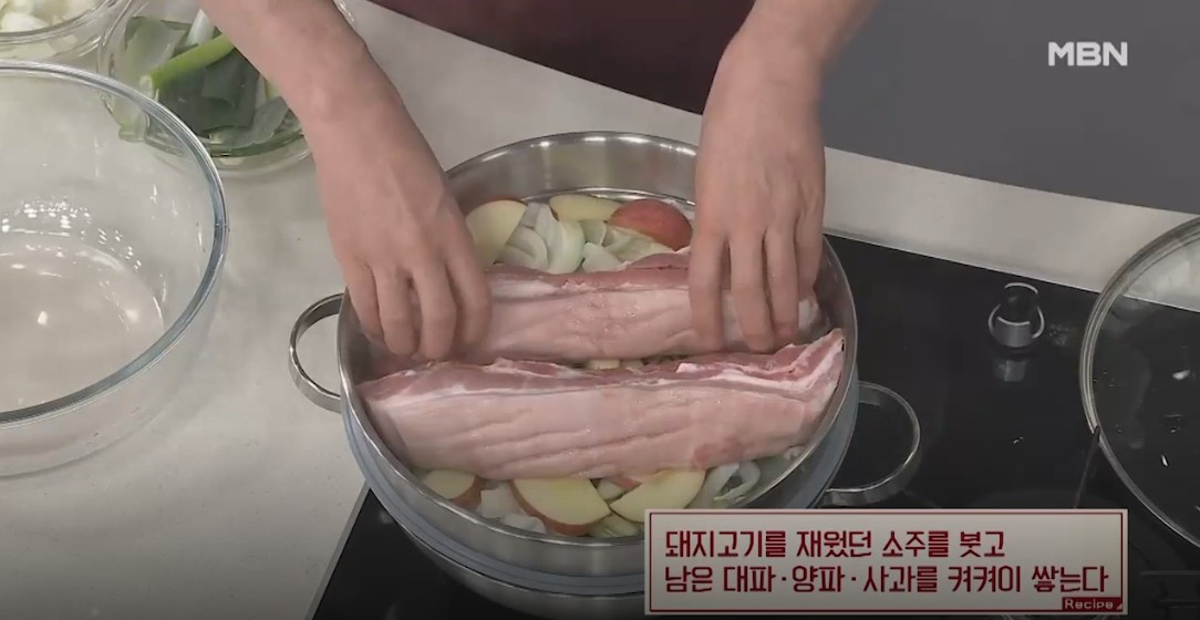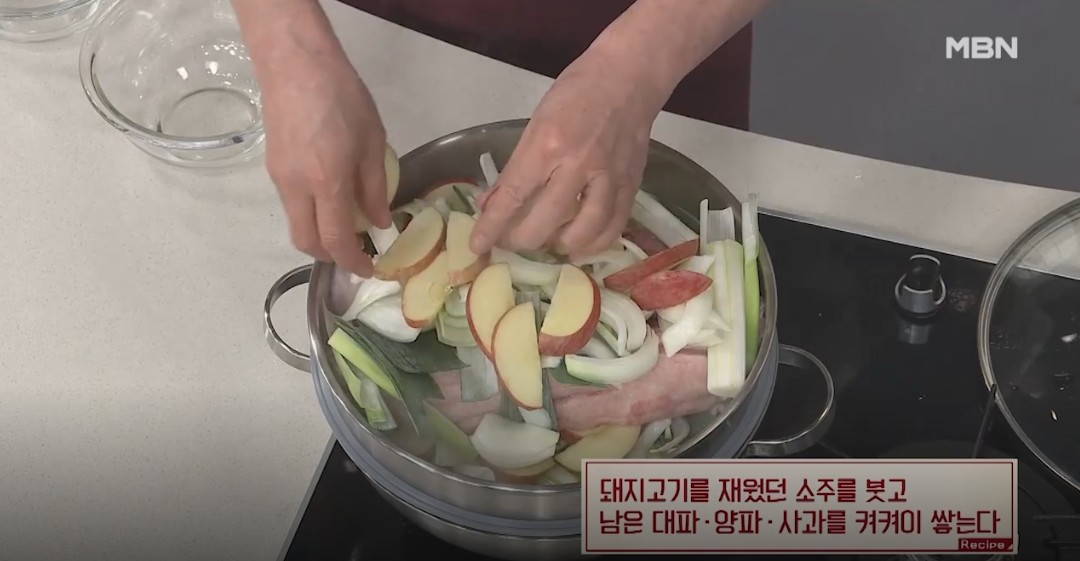 3. 돼지고기와 고기를 재웠던 소주를 위에 부어주고, 남은 대파, 양파, 사과를 켜켜이 쌓아주세요.