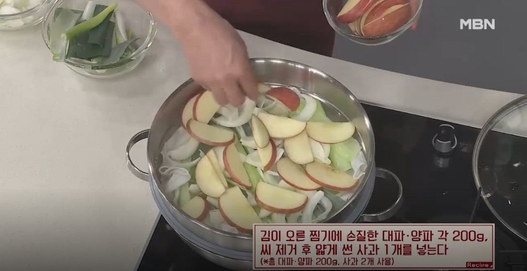 2. 김이 오른 찜기에 면보를 깔고 손질한 대파, 앙파를 각각 200g, 얇게 썬 사과1개 중 반을 깔아줍니다.