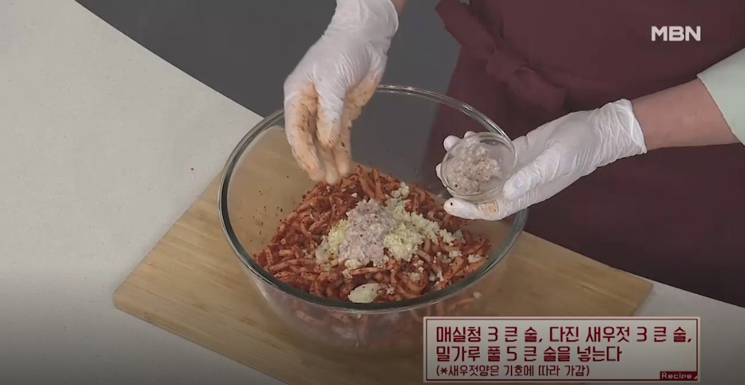 4. 매실청 3큰술, 다진 새우젓 3큰술, 밀가루 풀 5큰술을 넣습니다. (새우젓의 양은 기호에 따라 가감해주세요)