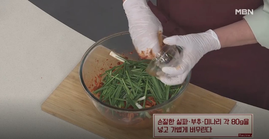 5. 손질한 실파, 부추, 미나리를 한줌씩 넣고 가볍게 버무립니다.