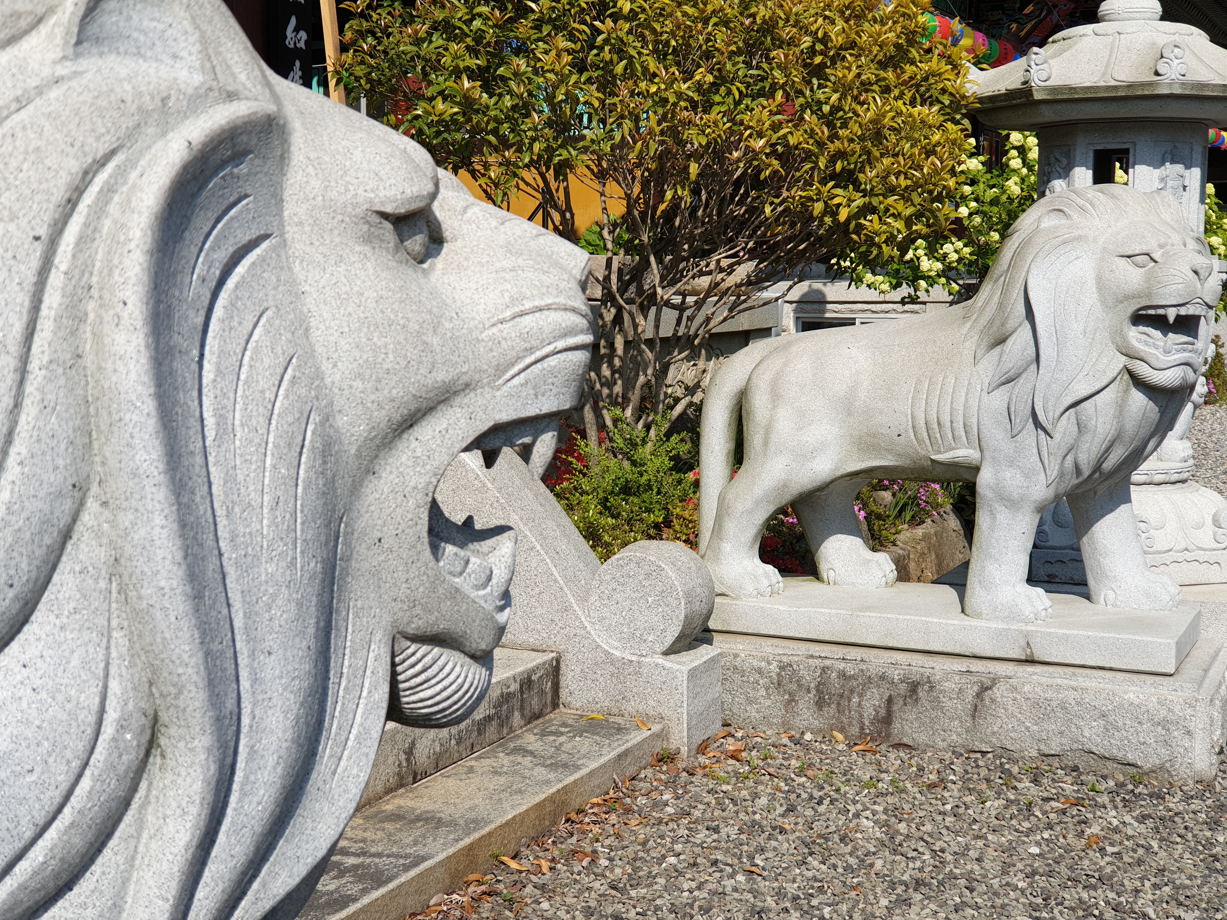 대웅전 앞의 사자상과 석등의 모습이예요. 잘 정비되어 깨끗하고 단정한 분위기의 사찰이예요.
