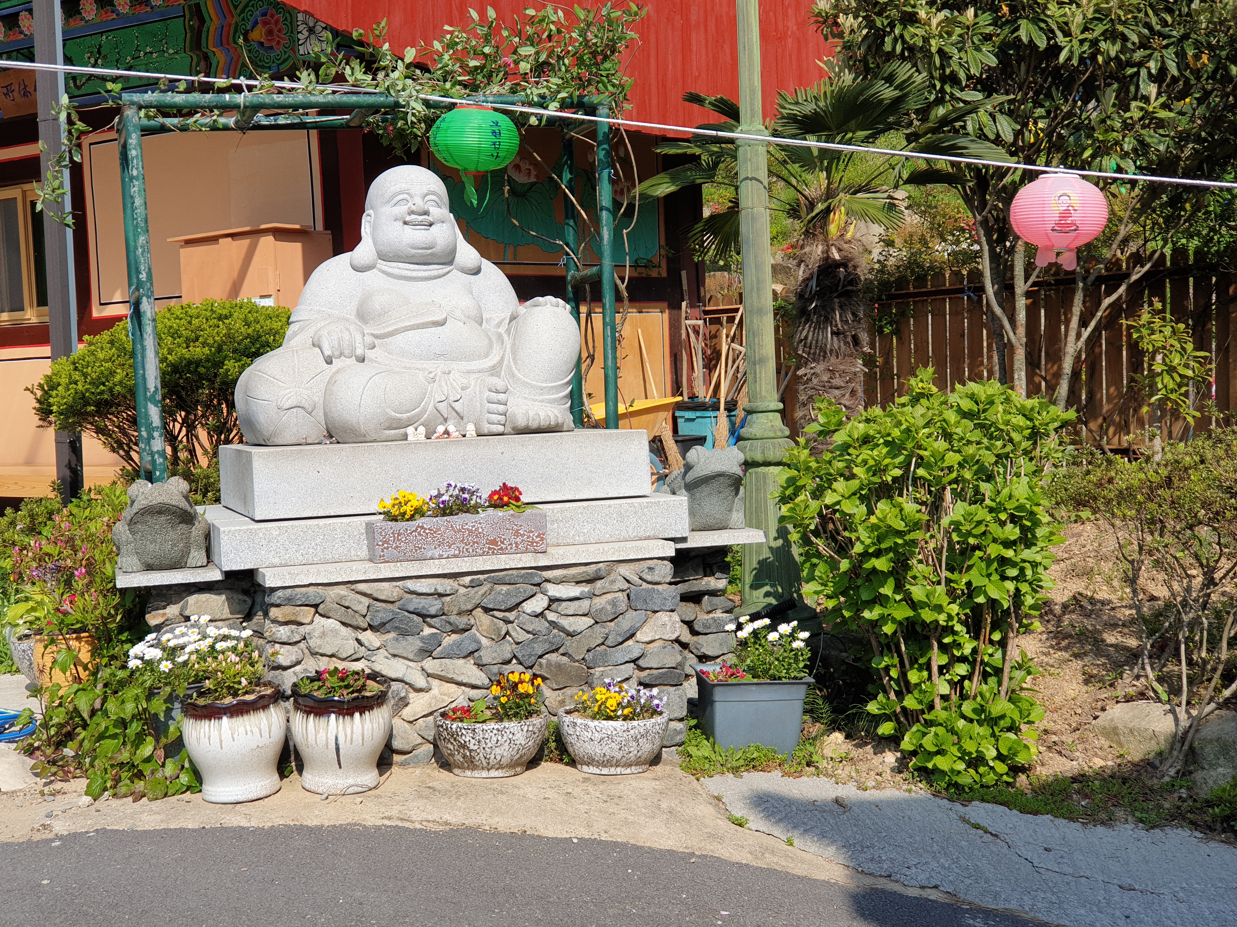 산에는 나무들이 푸릇한 잎을 띄워주고 있고, 절안에 화단에는 화려한 색의 꽃이 자태를 뽐내고 있어요.