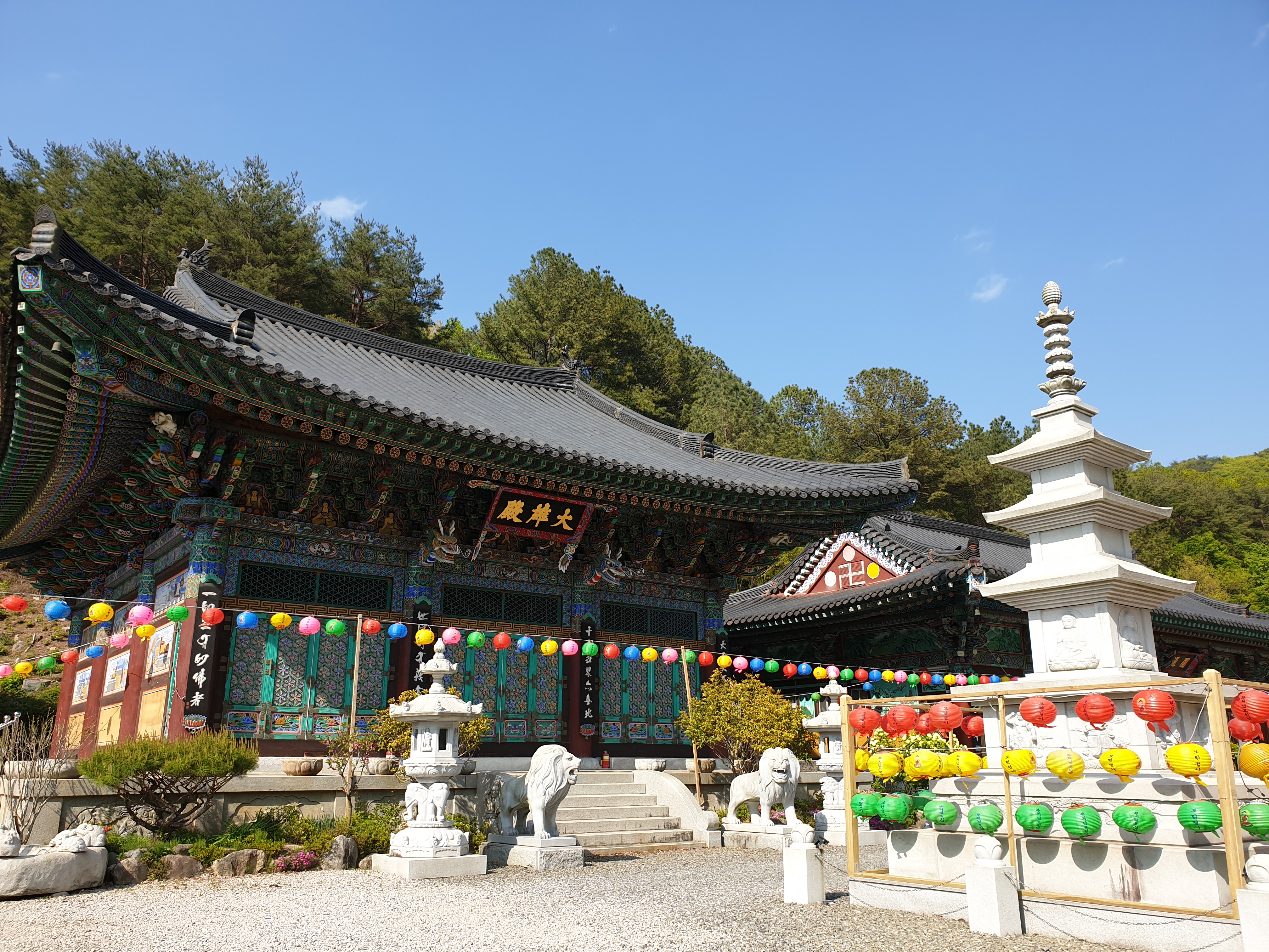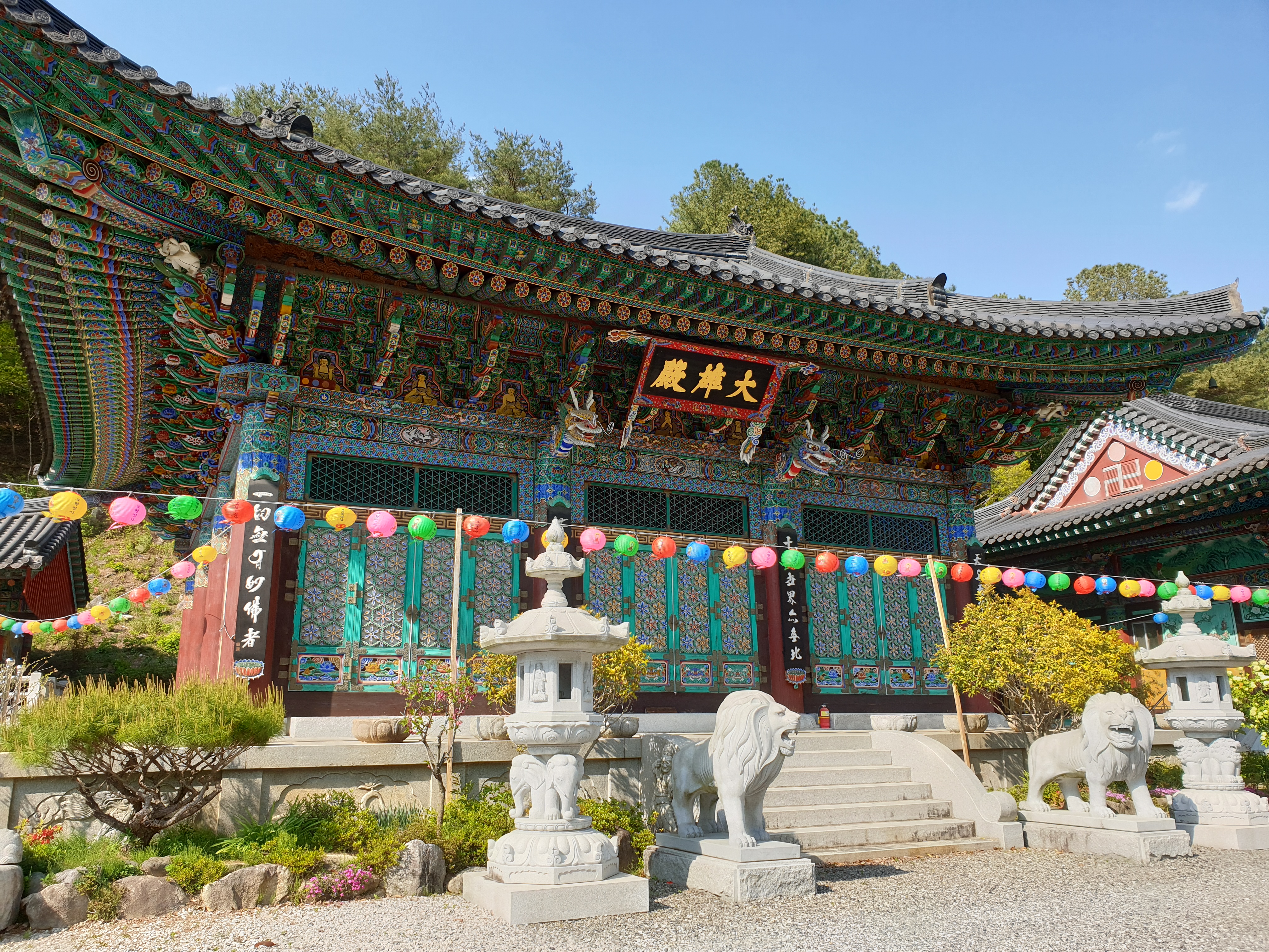 대웅전 앞의 사자상과 석등의 모습이예요. 잘 정비되어 깨끗하고 단정한 분위기의 사찰이예요.