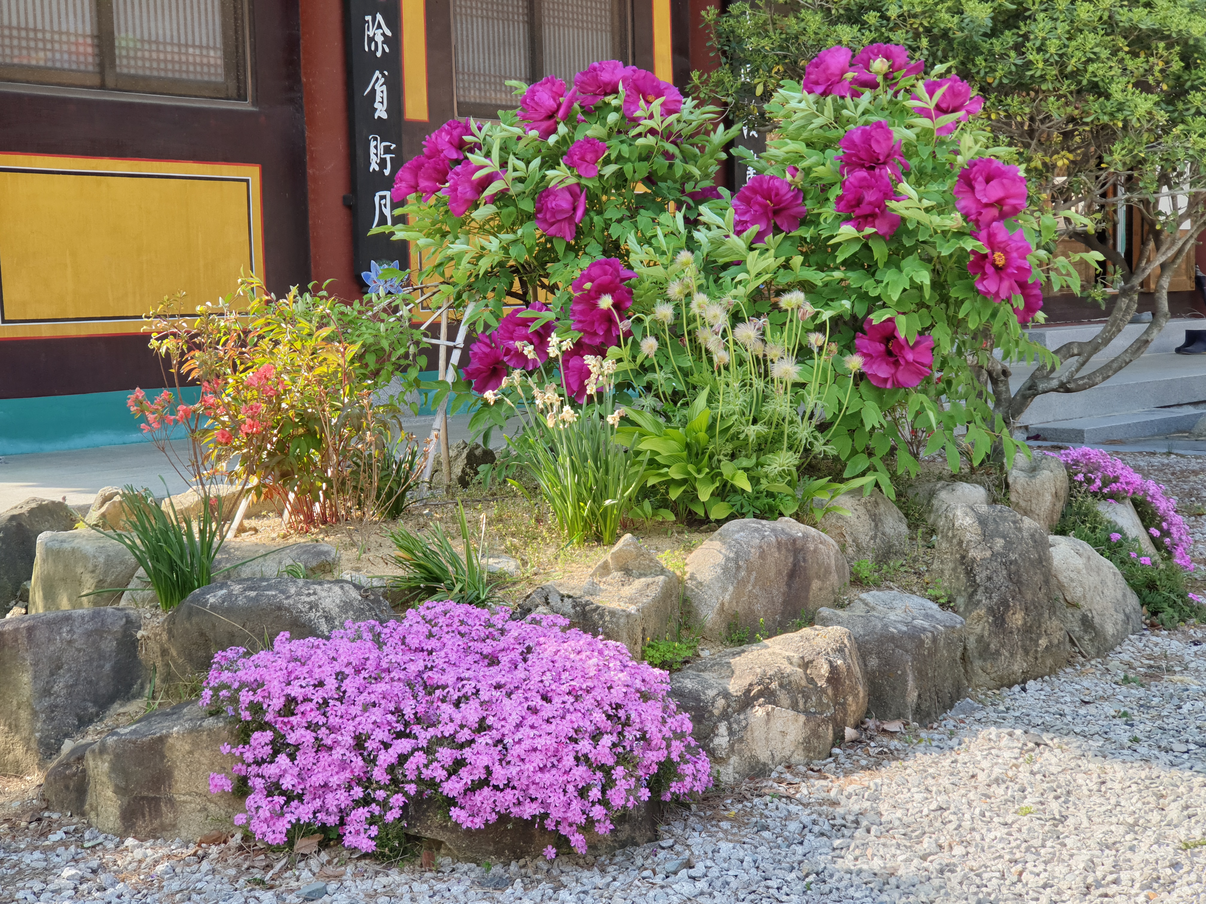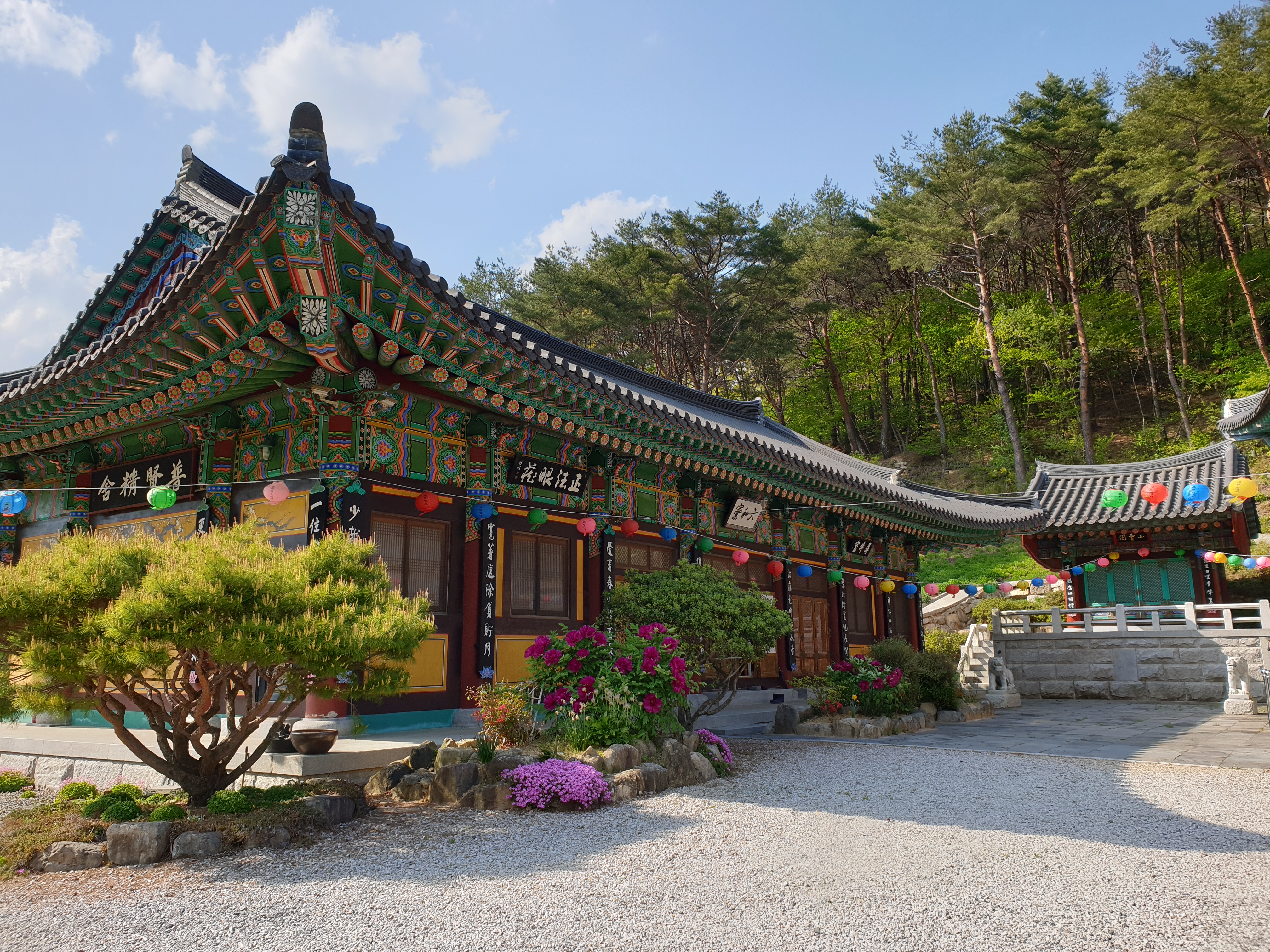 산에는 나무들이 푸릇한 잎을 띄워주고 있고, 절안에 화단에는 화려한 색의 꽃이 자태를 뽐내고 있어요.