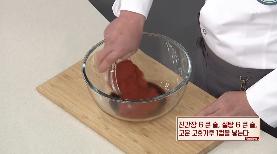 1. 진간장6큰술, 설탕6큰술, 고운고춧가루1컵을 넣는다.