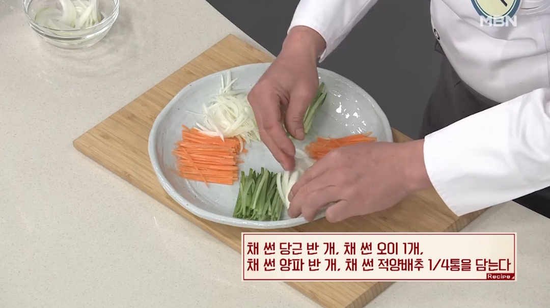 2. 채썬 당근반개, 채썬 오이1개, 채썬 양파 반개, 채썬 적양배추 1/4통을 담는다.