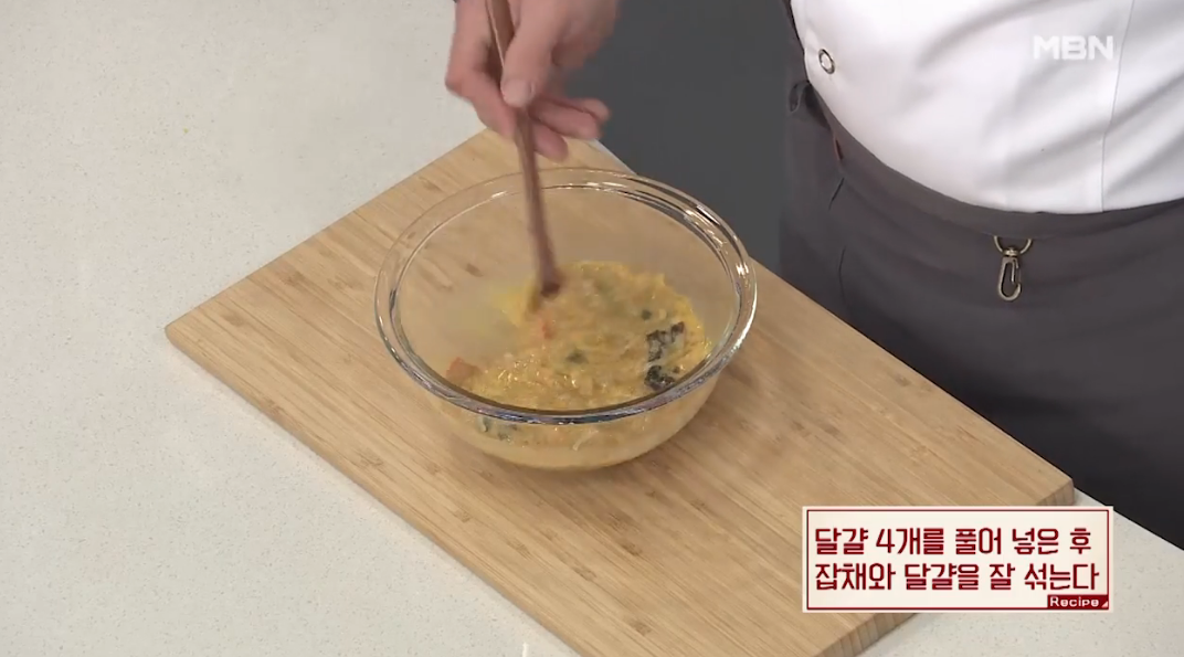 2. 달걀4개를 풀어 넣은 후 잡채와 달걀을 잘 섞는다.
