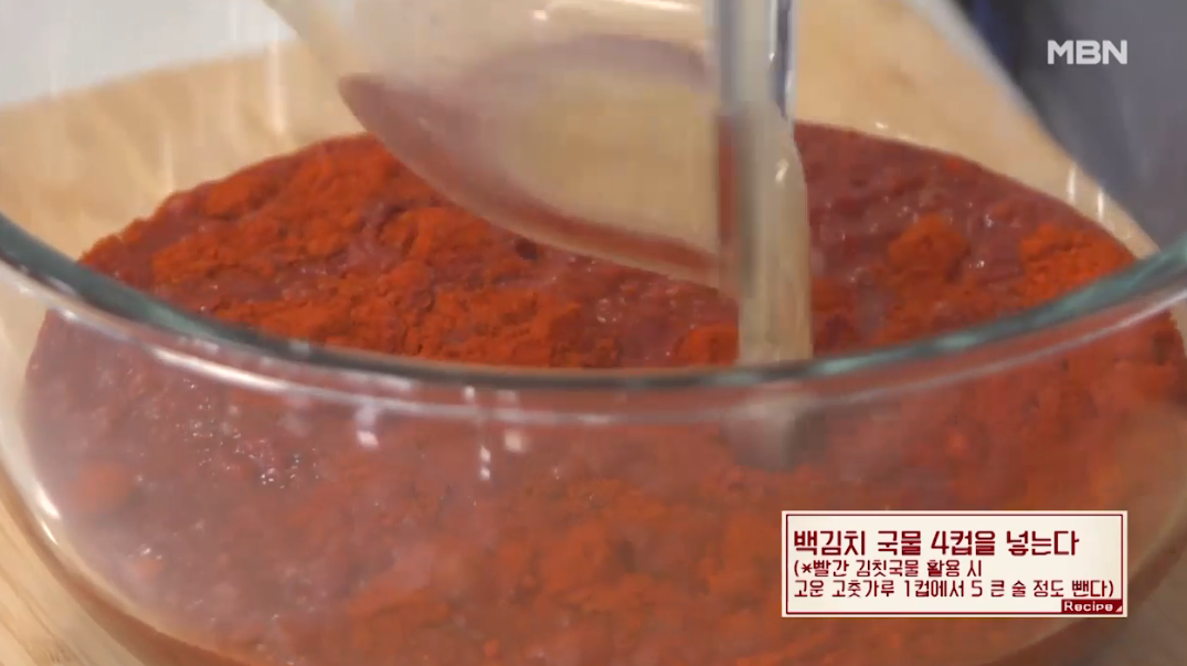 2. 백김치 국물 4컵을 넣는다. (빨간 김칫국물을 활용시 고운 고춧가루 1컵에서 5큰술정도를 뺀다)