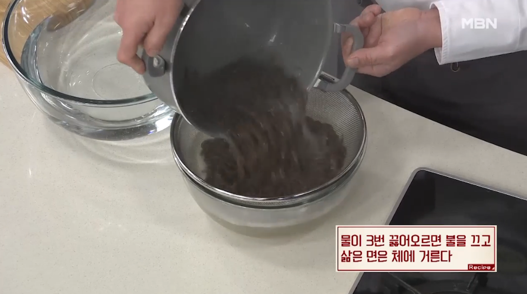 5. 물이 3번 끓어오르면 불을 끄고 삶은 면은 체에 거른다.