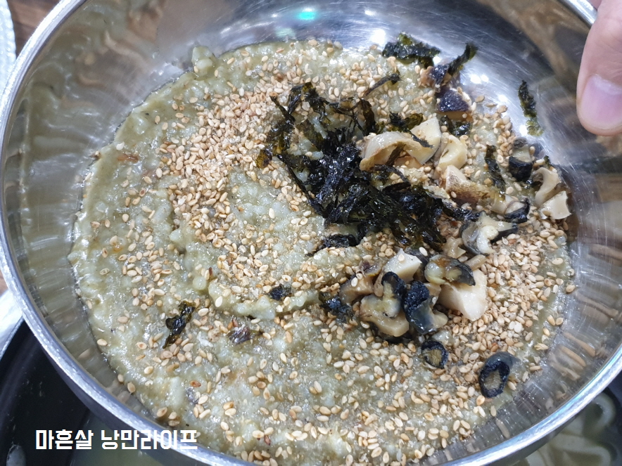 원래는 칼국수만 주문하려고 했는데, 식당이모님이 강력추천한 이 보말죽 때문에 커플세트를 주문하게 되었어요. 마치 비주얼이 전복죽과 흡사하죠? 참깨가 듬뿍 뿌려져있네요. 고소하고 부드럽고 쫄깃한 보말식감도 좋아요.