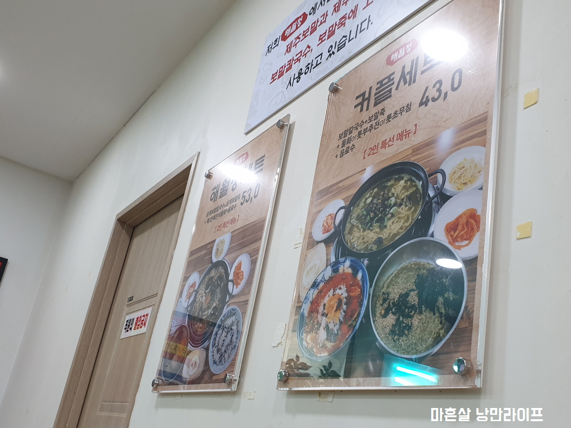 보말칼국수, 보말죽, 물회 또는 톳부추전 또는 톳초무침 중에 하나 선택, 음료수... 모두 해서 4만3천원이예요. 결코 저렴한 가격은 아니네요. 역시 제주도물가는 만만치않아요.