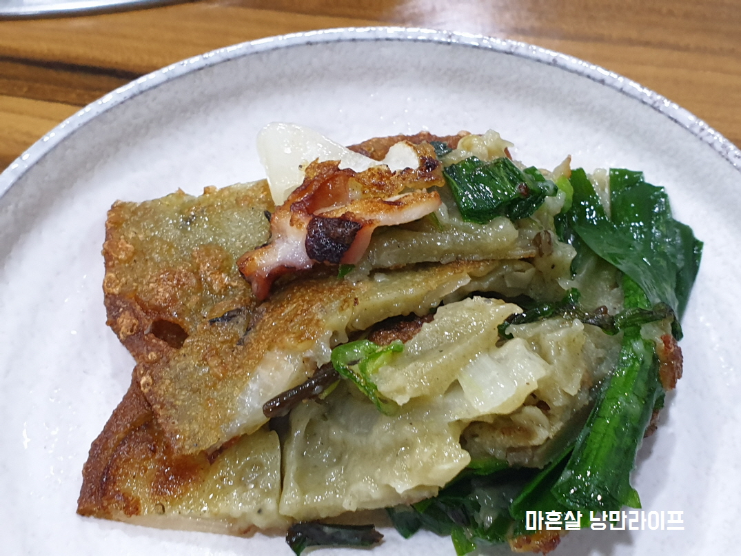 제가 마음에 들어했던 톳부추전이예요. 가장자리에 바삭바삭하니 너무 맛있더라구요. 톳이 들어간건지 잘 못느낄정도구요. 파전과 거의 비슷해요.