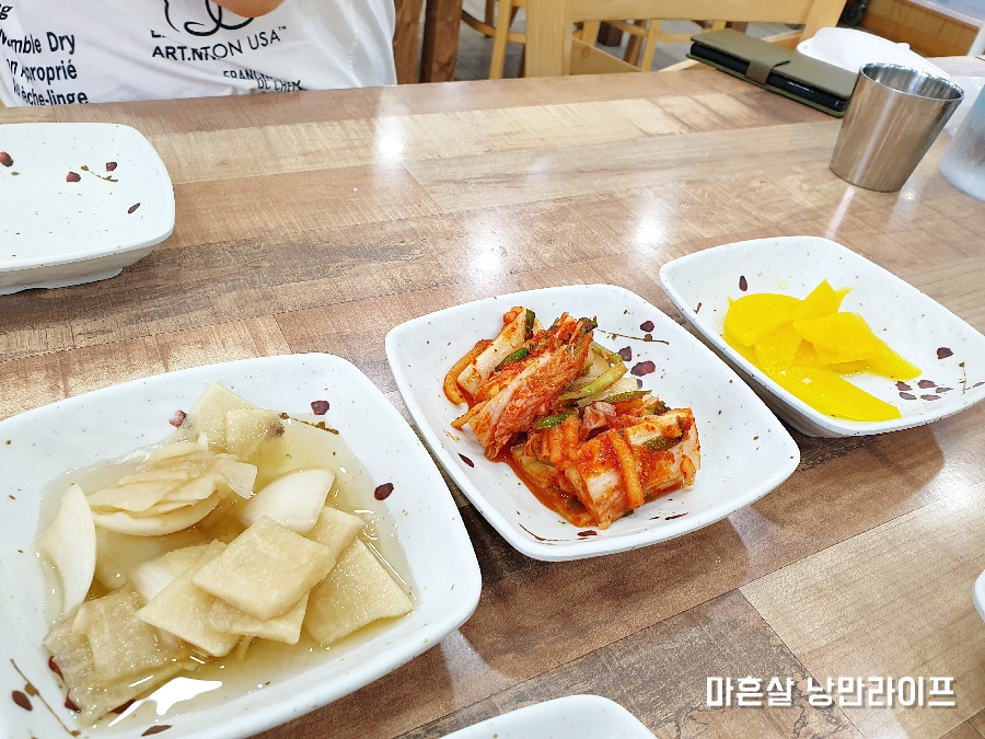 밑반찬은 단출하구요. 피클과 배추김치, 그리고 단무지...