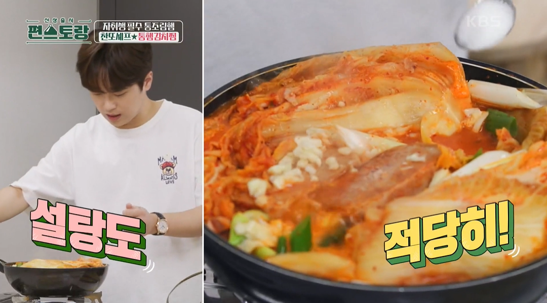 이찬원은 떡국떡과 만두, 소시지를 넣었어요. 맛없을 수 없는 조합!