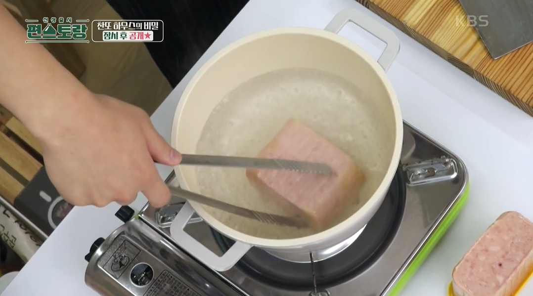 스팸은 가공식품이기 때문에 겉의 기름기와 잡내를 제거하기 위해 끓는 물에 한번 데쳐줍니다.