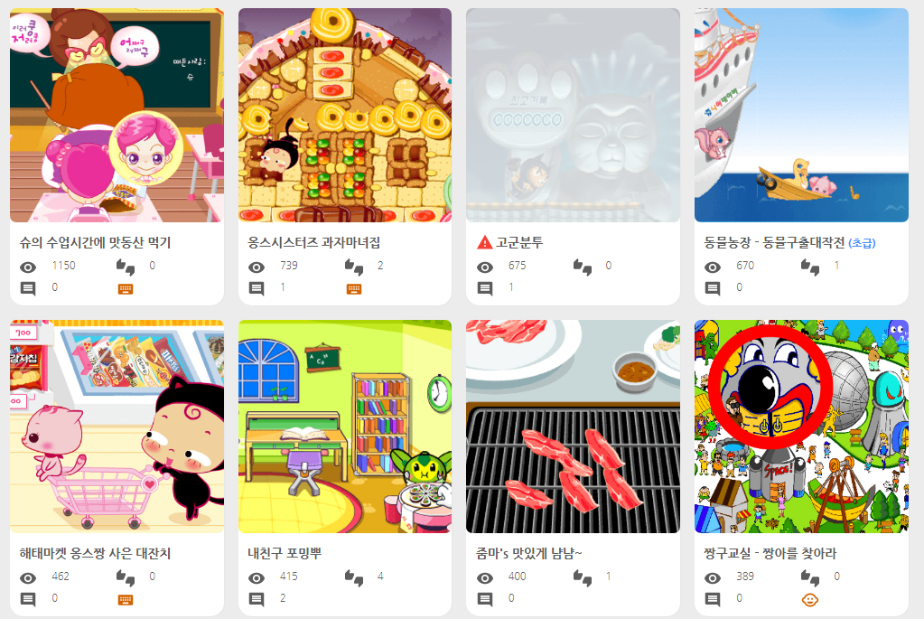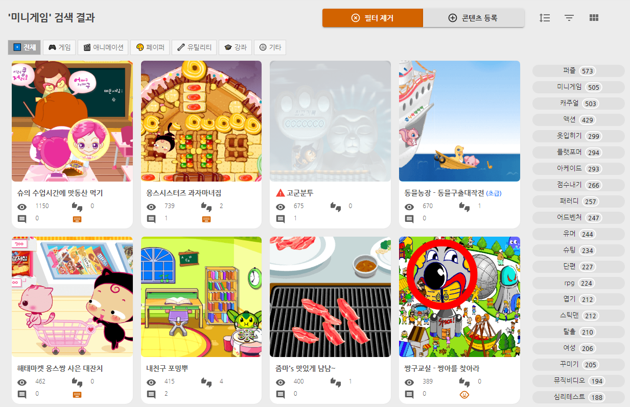 조회순으로 정렬했더니 가장 많은 조회수를 기록한 미니게임은 '슈의 수업시간에 맛동산 먹기'네요.