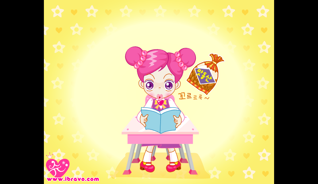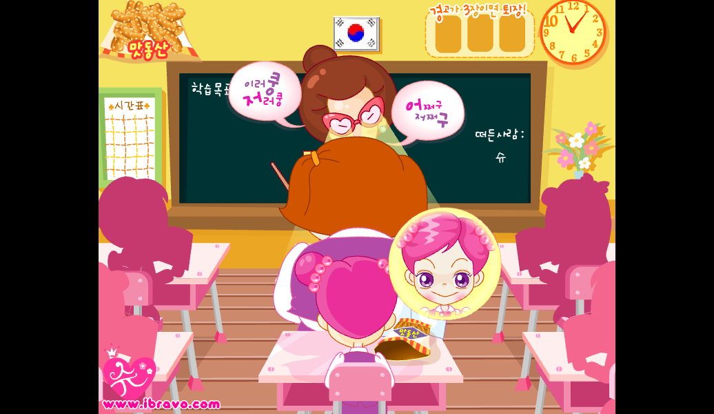선생님에게 들키지않고 맛동산 한봉지를 다먹으면 1스테이지가 클리어되는 게임이예요. 앞자리의 덩치큰 친구뒤로 잘 숨은 후 얼른 맛동산을 클릭해서 입에 넣어야하는데요.