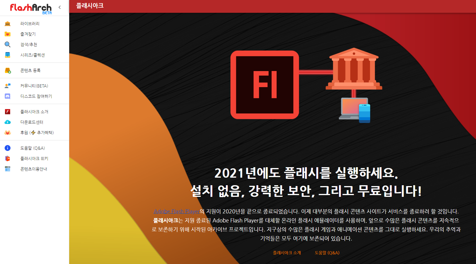 평소 플래시게임을 즐겨하던 유저들이라면 큰 아쉬움이 남으실거예요. 그래서 제가 플래시게임 뿐만 아니라 애니메이션이나 유틸 등 플래시를 사용해 구동하던 프로그램들을 설치없이 할 수 있는 아카이브 사이트를 소개해드립니다.