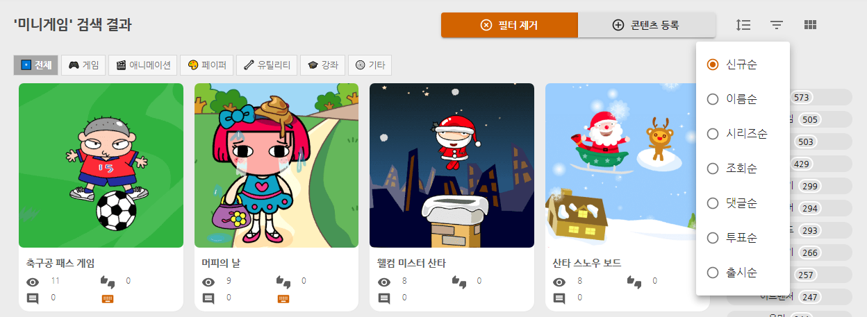 저는 미니게임으로 이동해서 조회순으로 검색해보았어요.