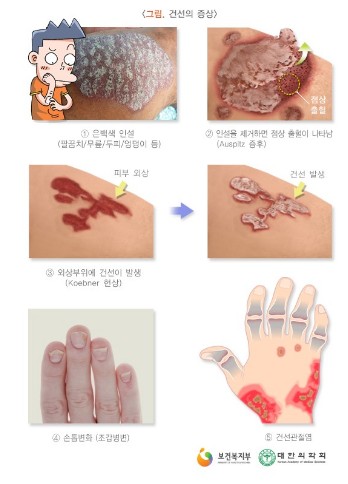 이 증상은 건선과 매우 유사한데요. 건선은 대표적인 만성피부질환 중 하나로 쉽게 낫지않아 10년이상 앓기도 한다고 해요. 주로 마찰이 많은 관절부위와 엉덩이, 두피 등에 흔히 나타나는데, 심하면 손발톱 변형이나 관절염으로 이어지기도 합니다.