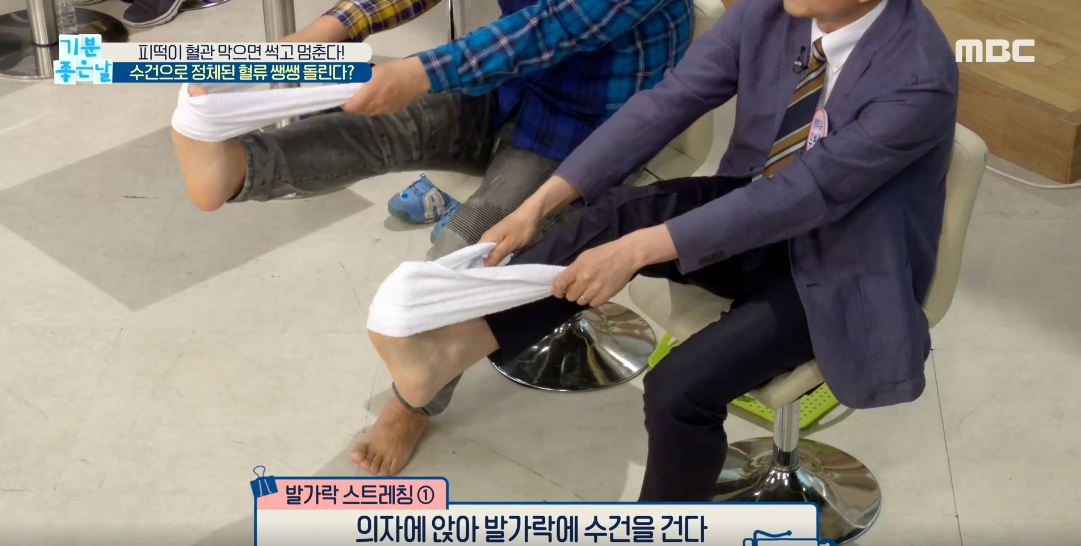 의자에 앉아서 발가락에 수건을 걸어줍니다.