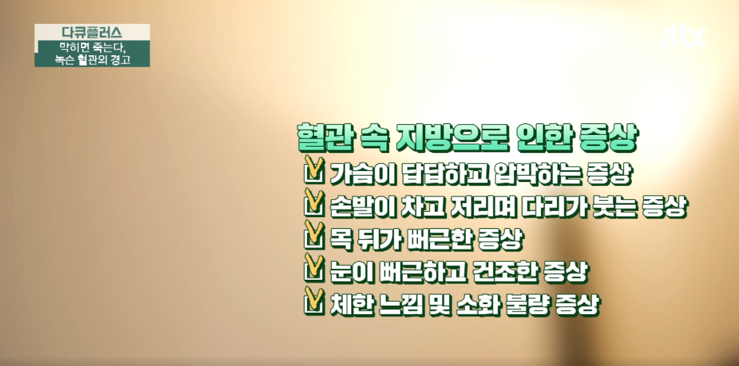 9월12일 방송된 다큐플러스에서는 '막히면 죽는다, 녹슨 혈관의 경고'라는 제목으로 혈관건강에 대한 내용을 심도있게 다루어 방송되었습니다. 쉽게 지나칠 수 있는 혈관건강이 나빠진 전조증상이 어떤 결과로 이어지는지 구체적으로 알려주어 매우 유용한 정보를 얻을 수 있었습니다.