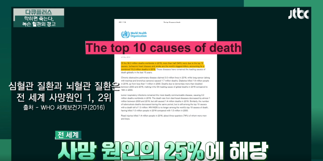 혈전이 가장 위험할 수 있는 것이 바로 뇌와 심장입니다. 전세계 사망원인의 25%가 심혈관질환과 뇌혈관질환이라는 것은 많이 알려진 사실입니다.