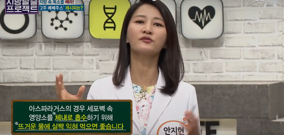 지용성 독소를 제거하는데 가장 중요한 재료가 바로 아스파라거스라고 해요. 이 아스파라거스에 들어있는 글루타치온이라는 성분이 간기능을 높여주어 지용성독소를 수용성독소로 만들어 배출을 도와준다고 해요.