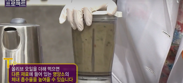 모든 재료를 넣고 믹서기에 갈아주면 됩니다 올리브오일을 넣어서 먹으면 다른 재료의 영양소들이 잘 흡수되도록 도와준다고 하니, 절대로 빠뜨리면 안되겠죠?