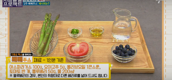 아스파라거스 100g, 오이고추 5g, 올리브오일 1큰술, 토마토 반개, 블루베리 50g (다른 베리류로 대체가능), 물 200ml